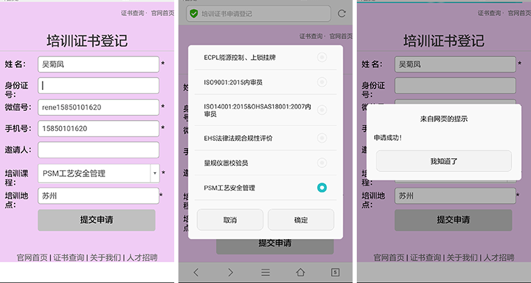 1. 登記證書信息—通過證書登記頁面登記自己的證書信息,包括姓名、手機、課程名稱,培訓日期和地點等,如下圖: