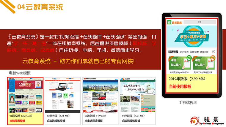 《云教育系統》由蘇州駿景企業管理咨詢有限公司(簡稱:駿景)聯合開發、設計的軟件,依法享有該軟件之所有權利。該平臺源碼開放,允許修改、轉發、復制、抄錄、發布,商業使用需要購買授權。