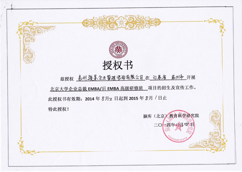 2014年8月1日,我司獲得腦庫(北京) 教育科學(xué) 研究院的授權(quán),在2014年8月2日到 2015年8月1日只,在蘇州市開展北京大學(xué)企業(yè)總載EMBA/后EMBA高級研修班項(xiàng)目的招生及宣傳工作。